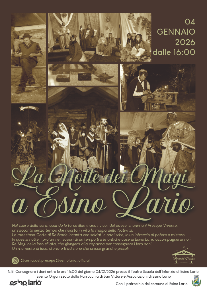 Il 4 gennaio 2026 si svolge a Esino Lario la notte dei magi con il presepe vivente e il tradizionale corteo dei magi.